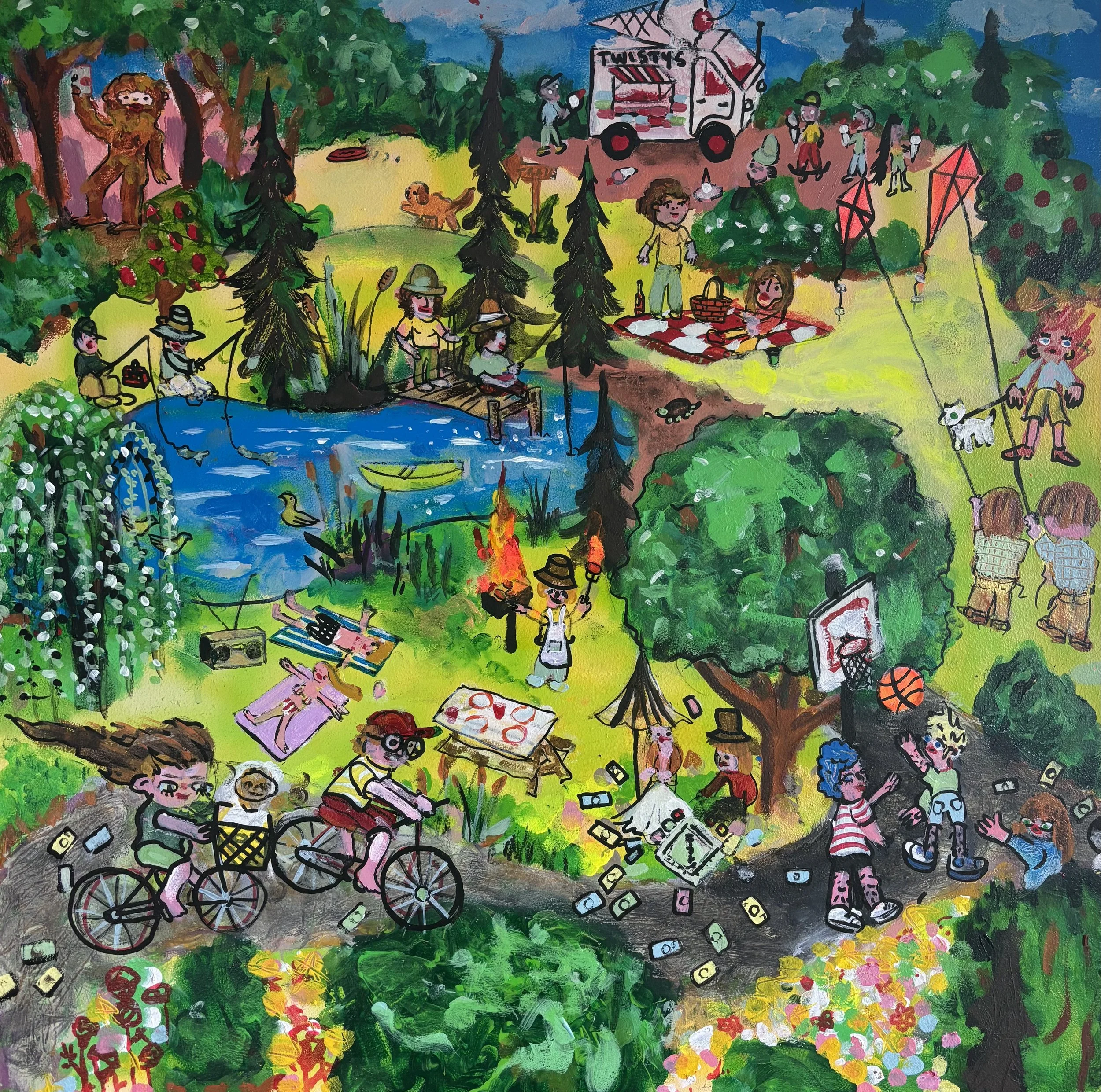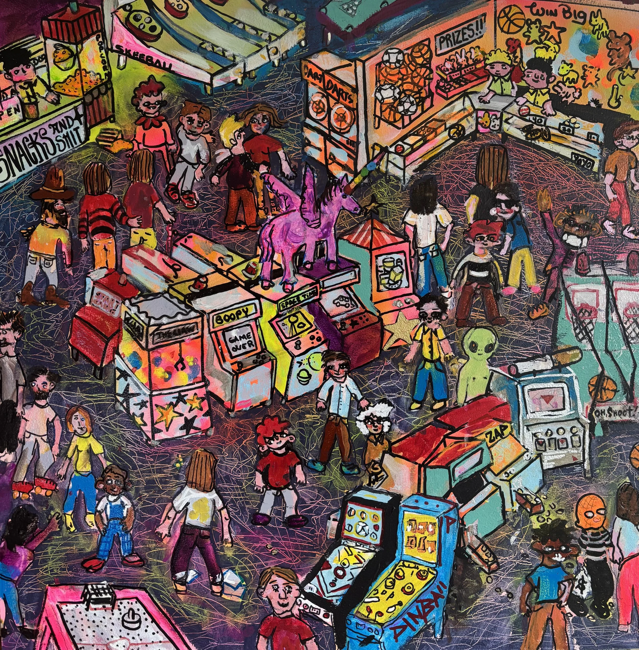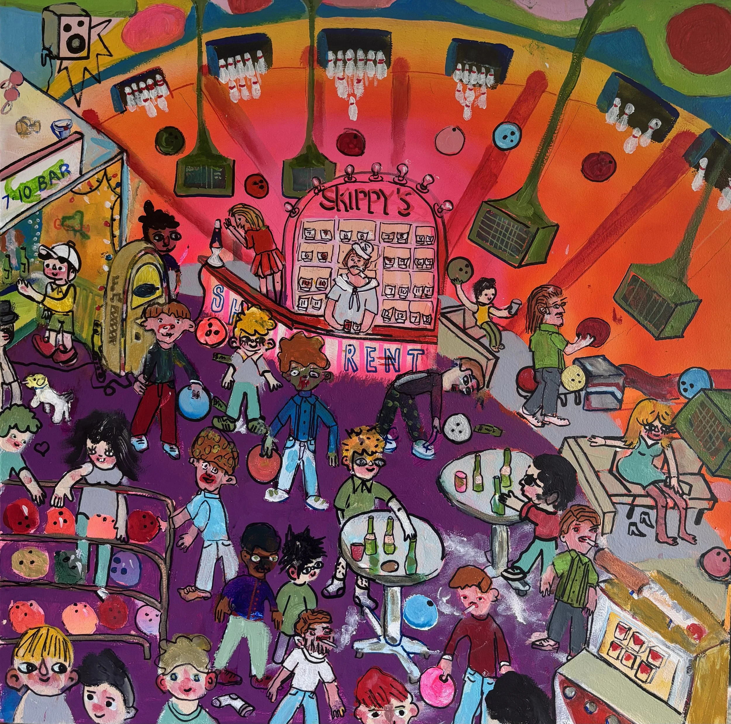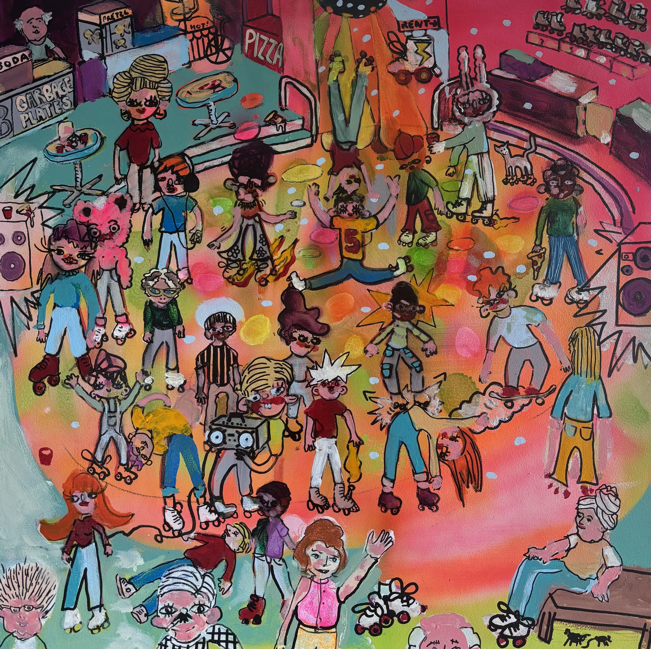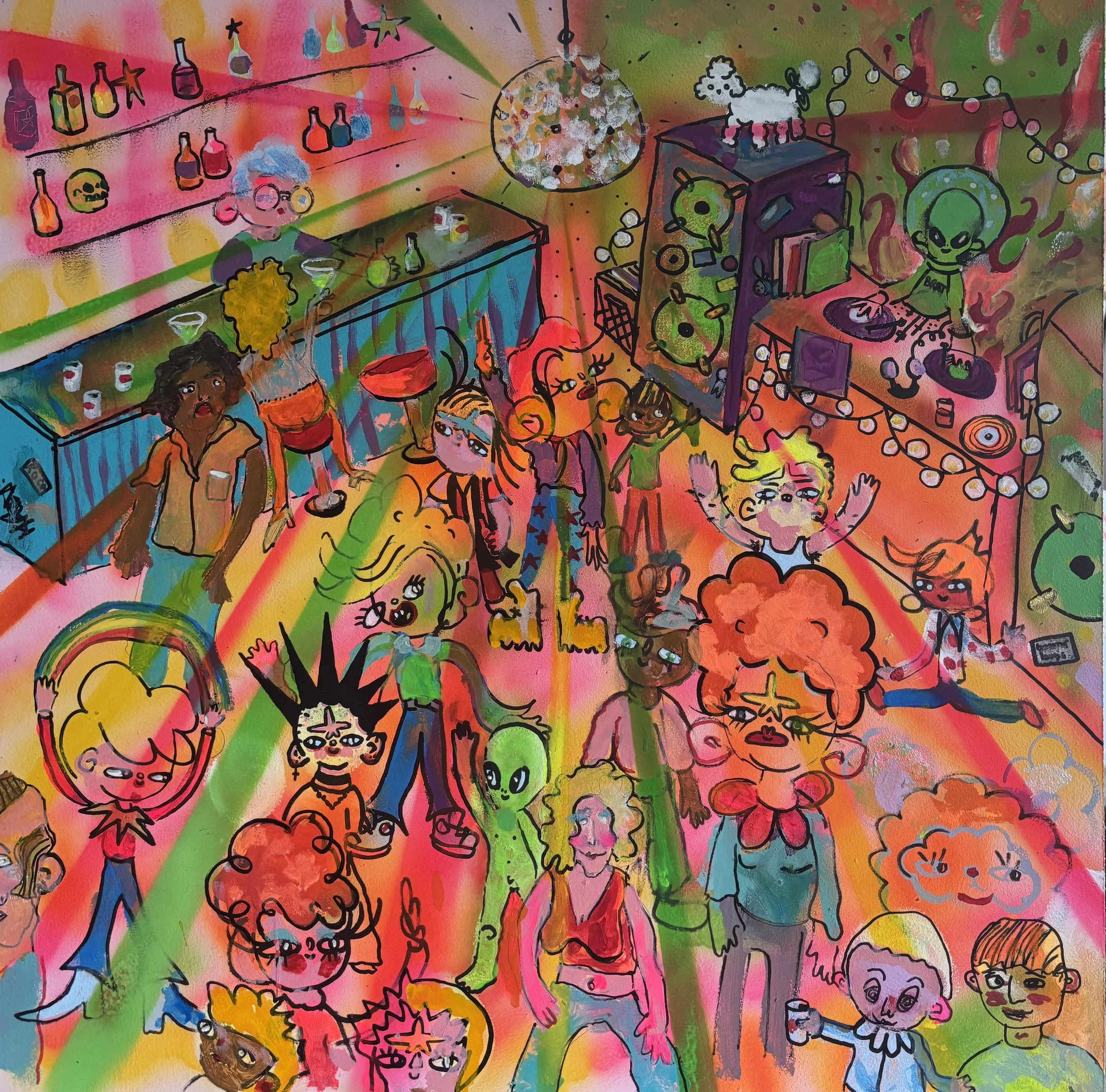 This current show “Marvelous, Mischievous, Tomfoolery” at Lumiere on view from September 5, 2025 - September 27, 2025 has given the duo a chance to collaborate once again this time on a playful new series. Over the summer, they met regularly to create thirteen 2x2 foot paintings exploring high-energy, whimsical scenes: from roller rinks and dog parks to disco ballrooms, haunted parties, and miniature golf.