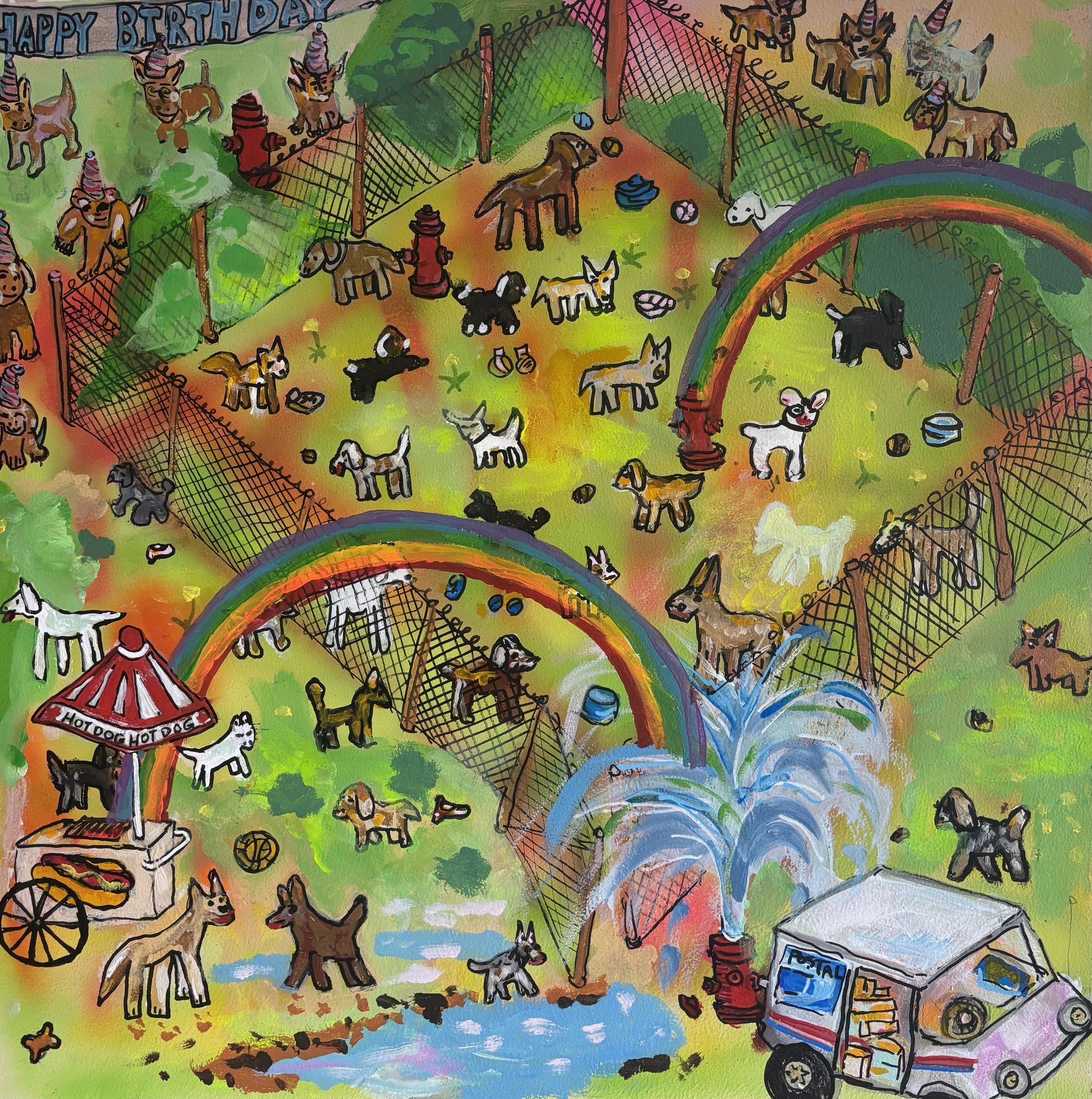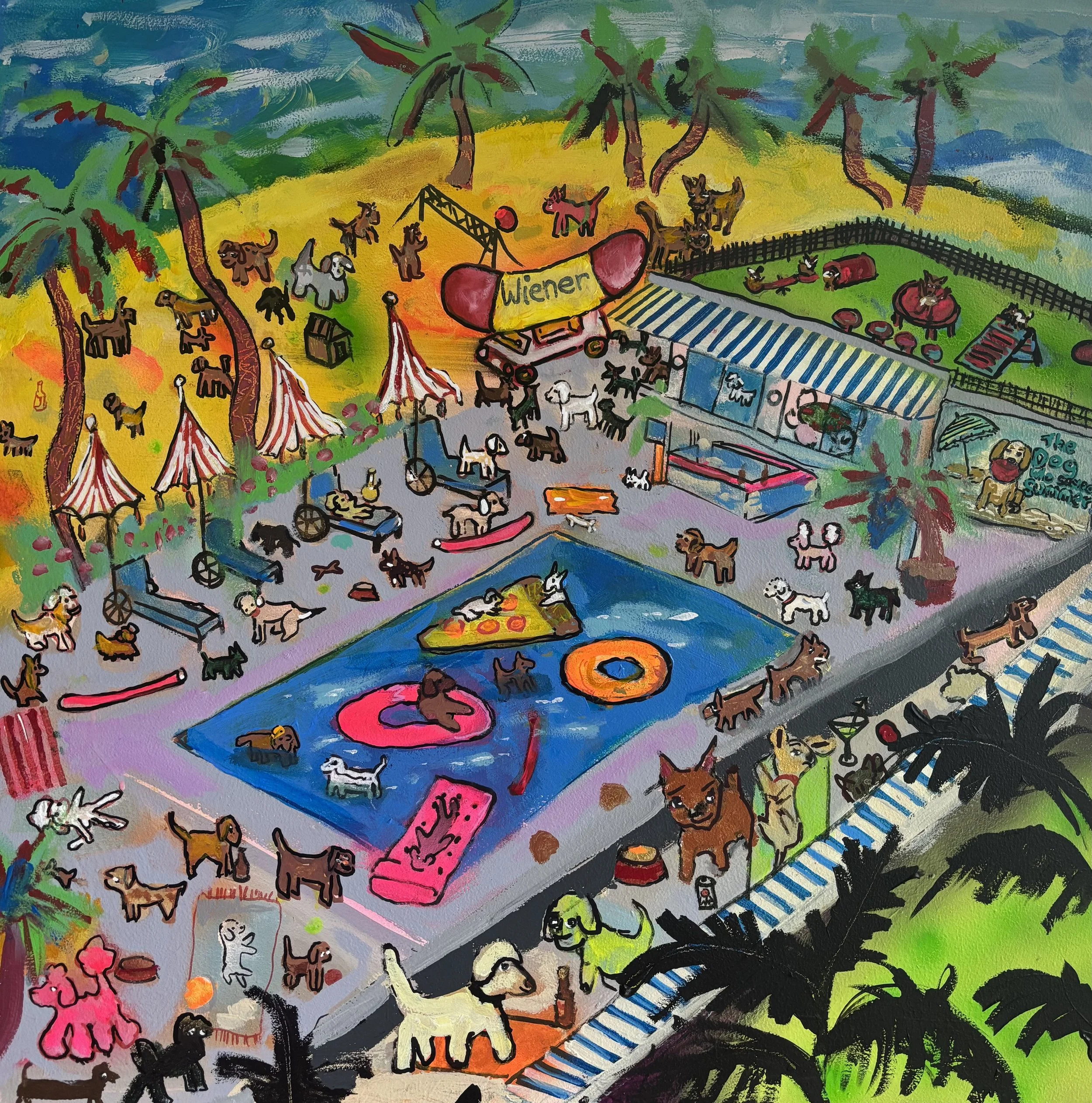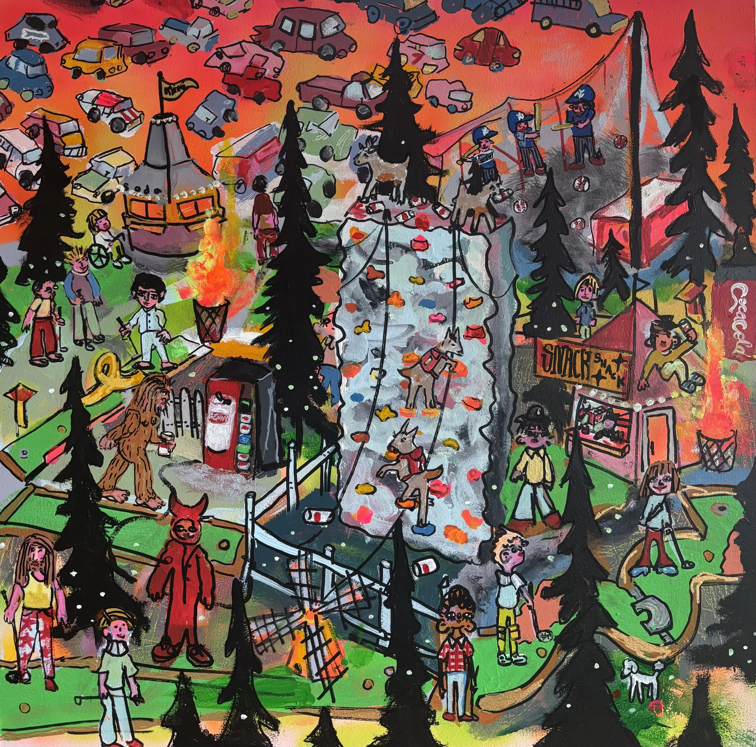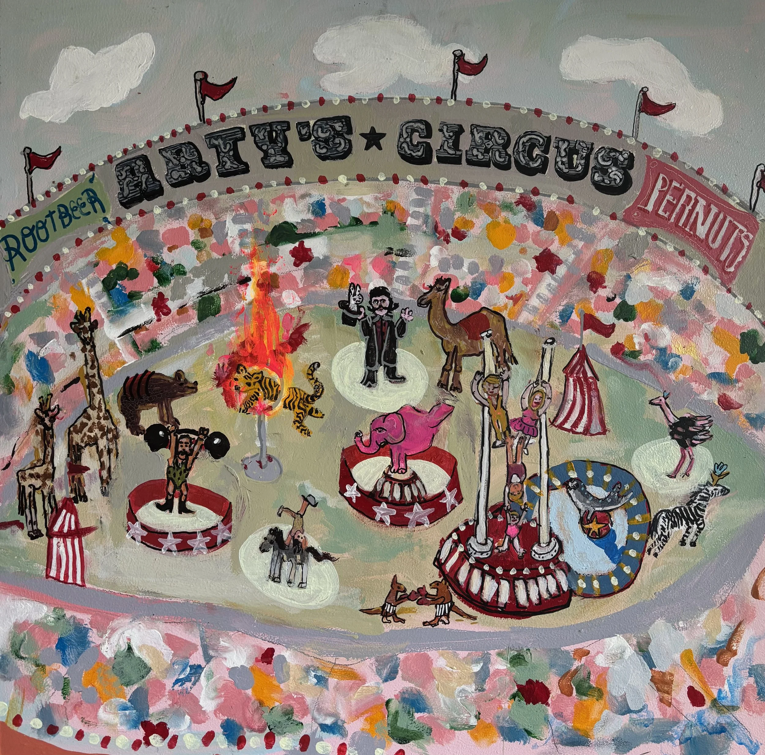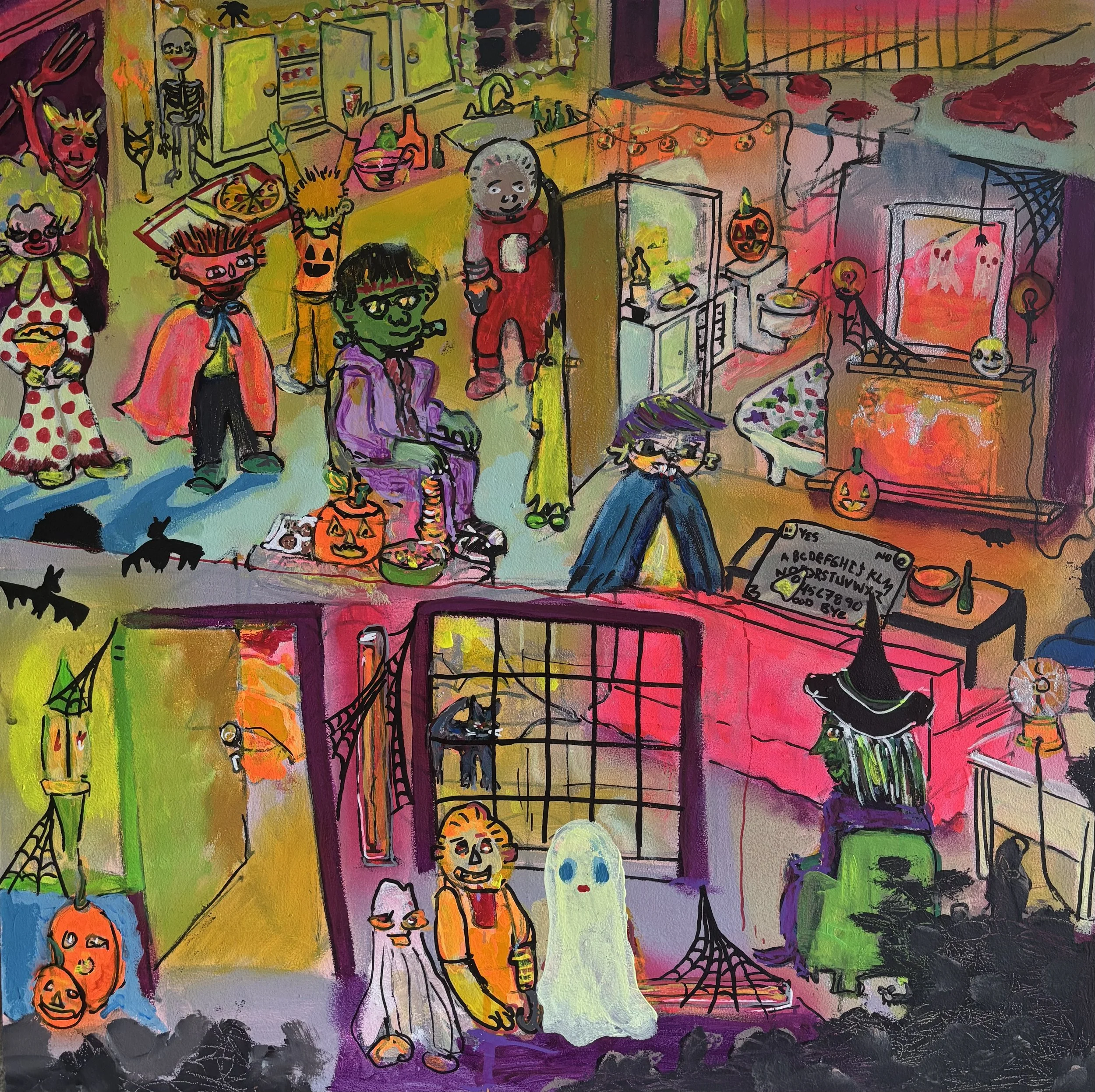 This current show “Marvelous, Mischievous, Tomfoolery” at Lumiere on view from September 5, 2025 - September 27, 2025 has given the duo a chance to collaborate once again this time on a playful new series. Over the summer, they met regularly to create thirteen 2x2 foot paintings exploring high-energy, whimsical scenes: from roller rinks and dog parks to disco ballrooms, haunted parties, and miniature golf.