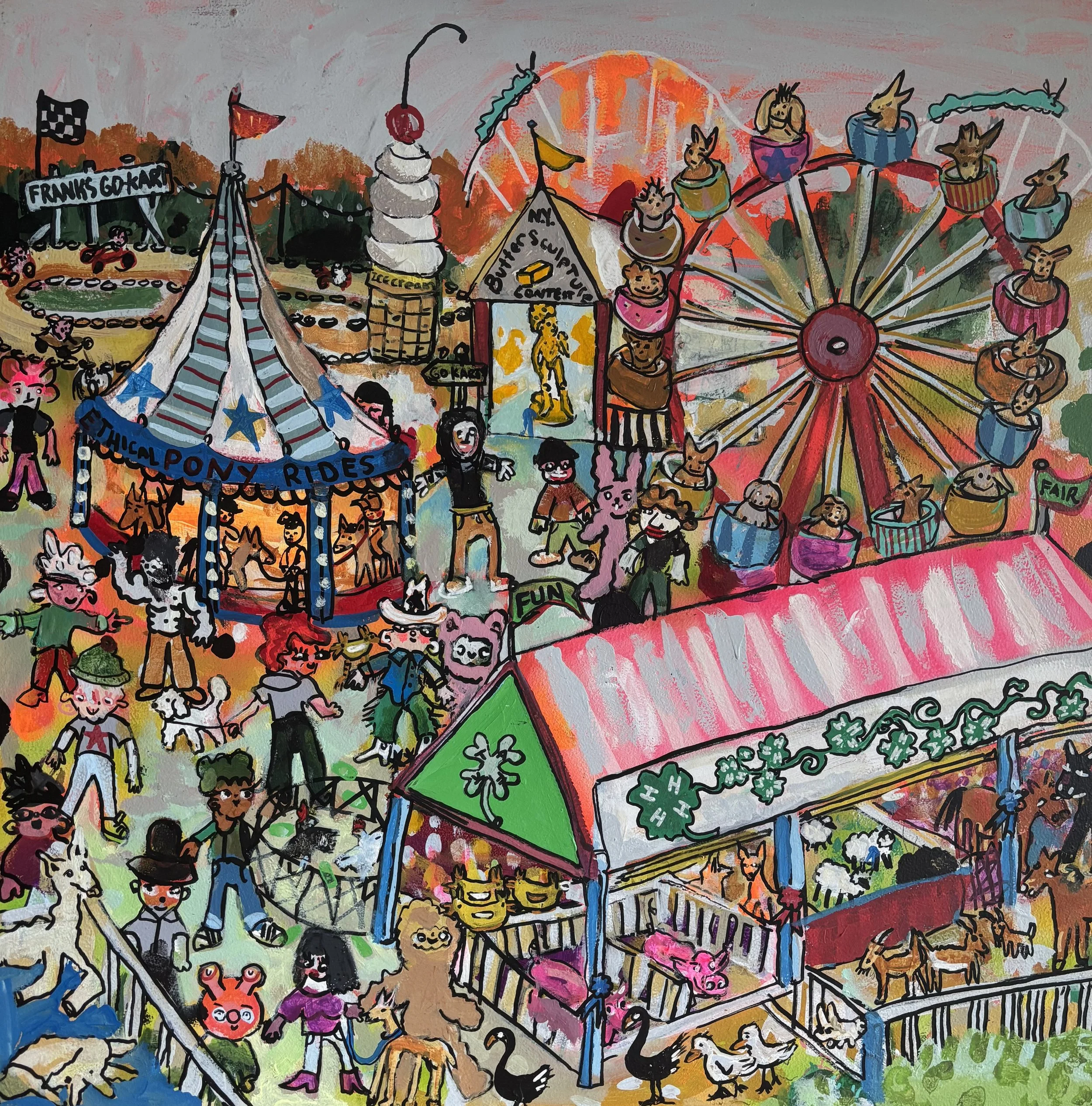 Their most recent collaboration began last fall at Monroe Community College’s Mercer Gallery. As alumni, they were invited to exhibit their individual work—then something unusual happened: the gallery gifted them a giant 7x7 foot canvas. Without hesitation, they dove in, co-creating a vivid carnival scene that reflects their mutual fascination with public spaces and the universal joy of a crowd. That piece was later accepted into the 69th Rochester-Finger Lakes Exhibition at the Memorial Art Gallery and will eventually return to the Mercer Gallery’s permanent collection.